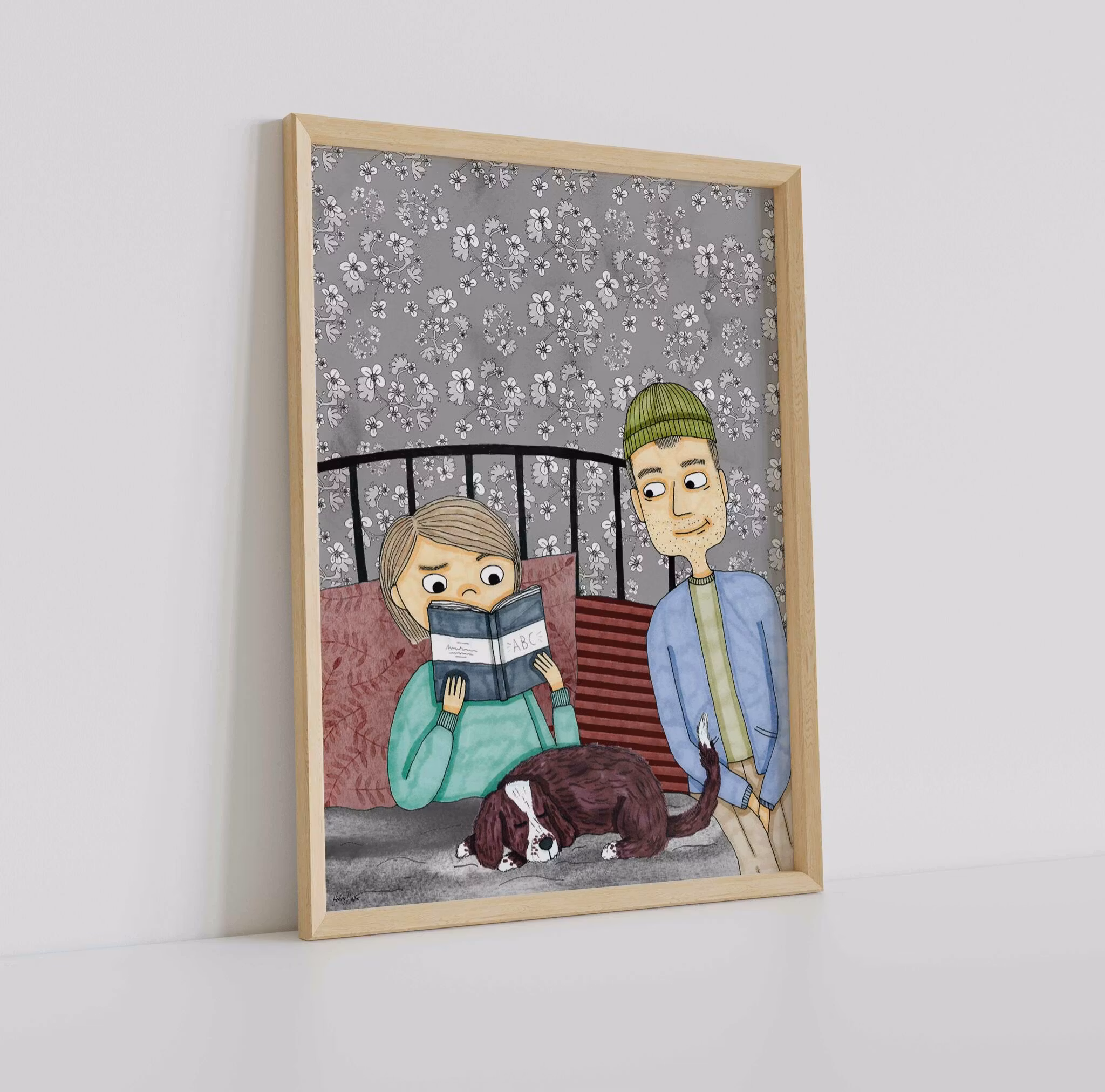 En lekfull och charmig poster med barnbokstema på Charlie som övar på läsning med sin pappa och hund. Illustration ur barnboken "Hejdå Gino!". Högkvalitativt print på 180 g FSC-certifierat, matt papper. Säljs i storlekarna 21x30 cm och 30x40 cm. Tillverkad i Sverige. Ram ingår ej.