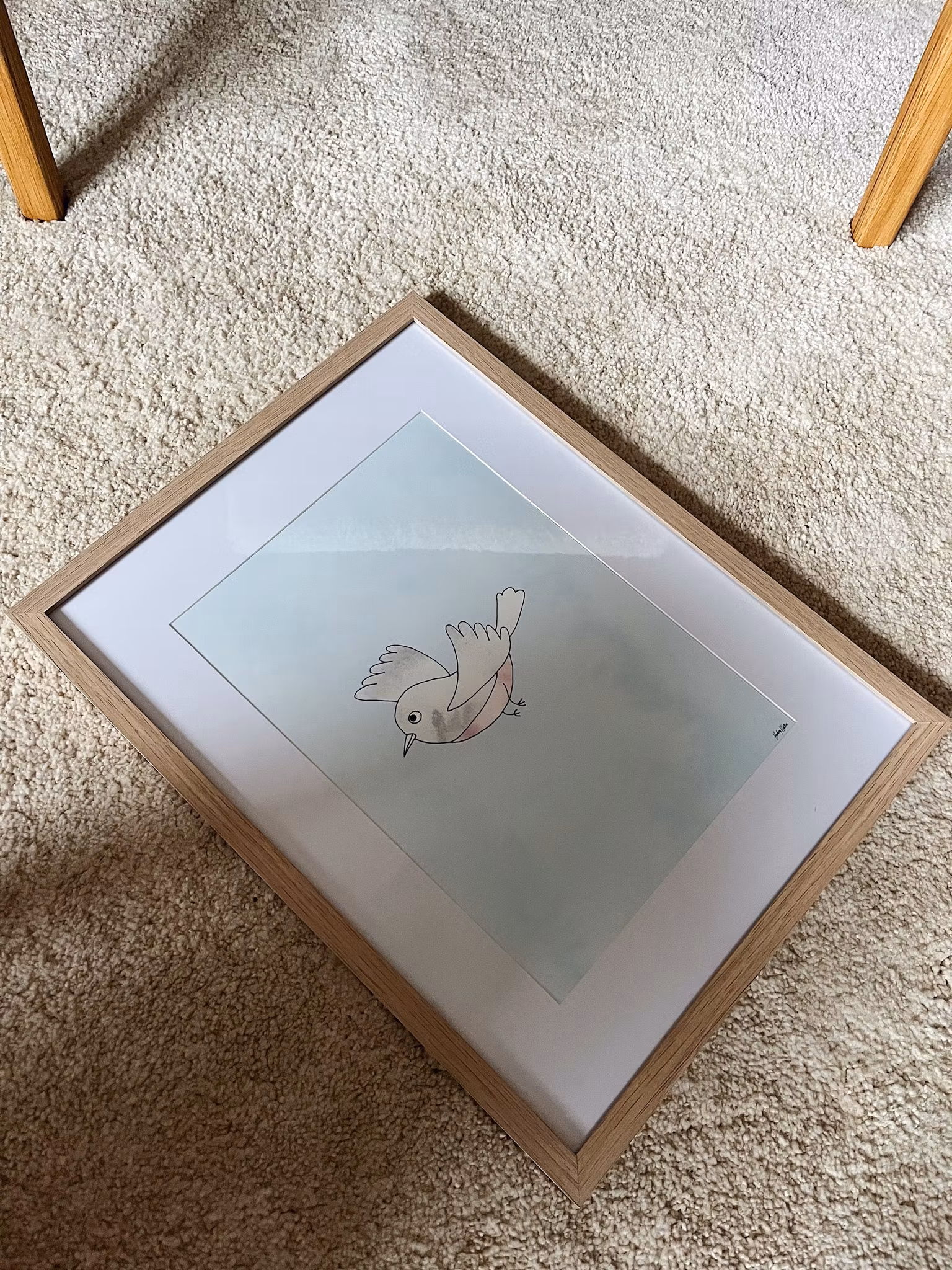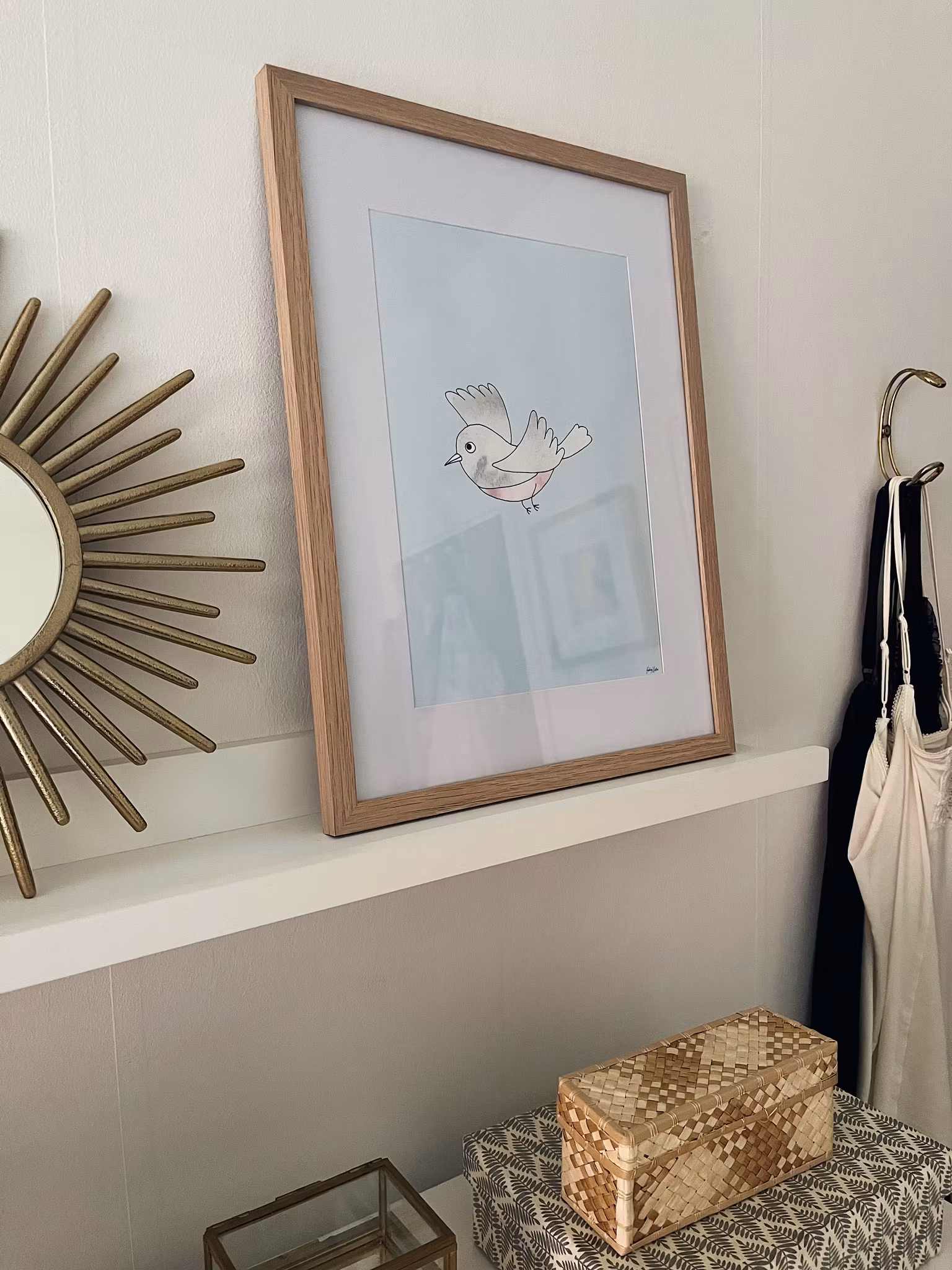 En charmig, simpel illustration av en fågel mot en blå himmel, med stora färgfält av akvarell. Högkvalitativt print på 180 g FSC-certifierat, matt papper. Säljs i storlekarna 21x30 cm och 30x40 cm. Tillverkad i Sverige. Ram ingår ej.