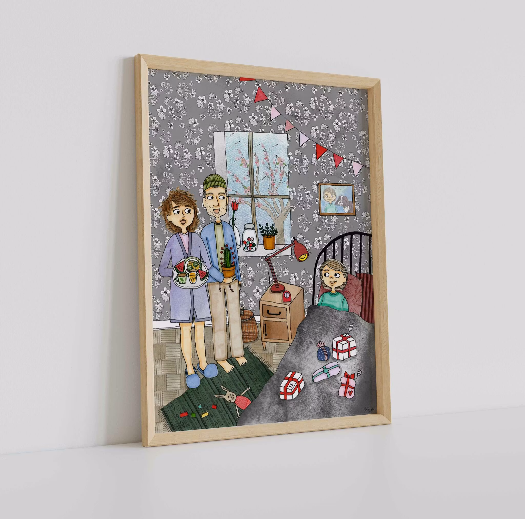 En detaljrik och lekfull poster med barnbokstema på ett födelsedagsbarn som blir firat på morgonen med presenter och frukost på sängen. Illustration ur barnboken "Hejdå Gino!". Högkvalitativt print på 180 g FSC-certifierat, matt papper. Säljs i storlekarna 21x30 cm och 30x40 cm. Tillverkad i Sverige. Ram ingår ej.