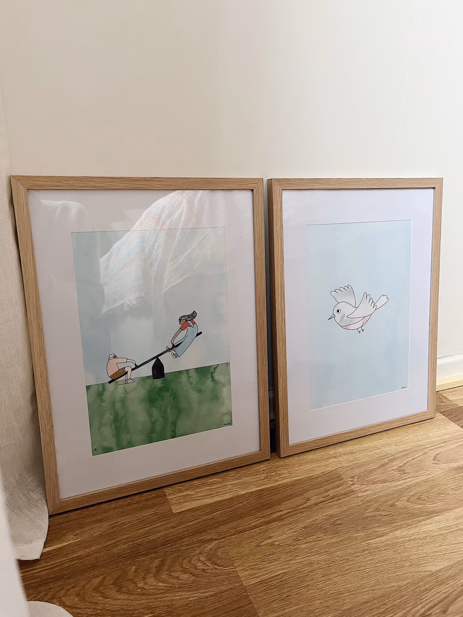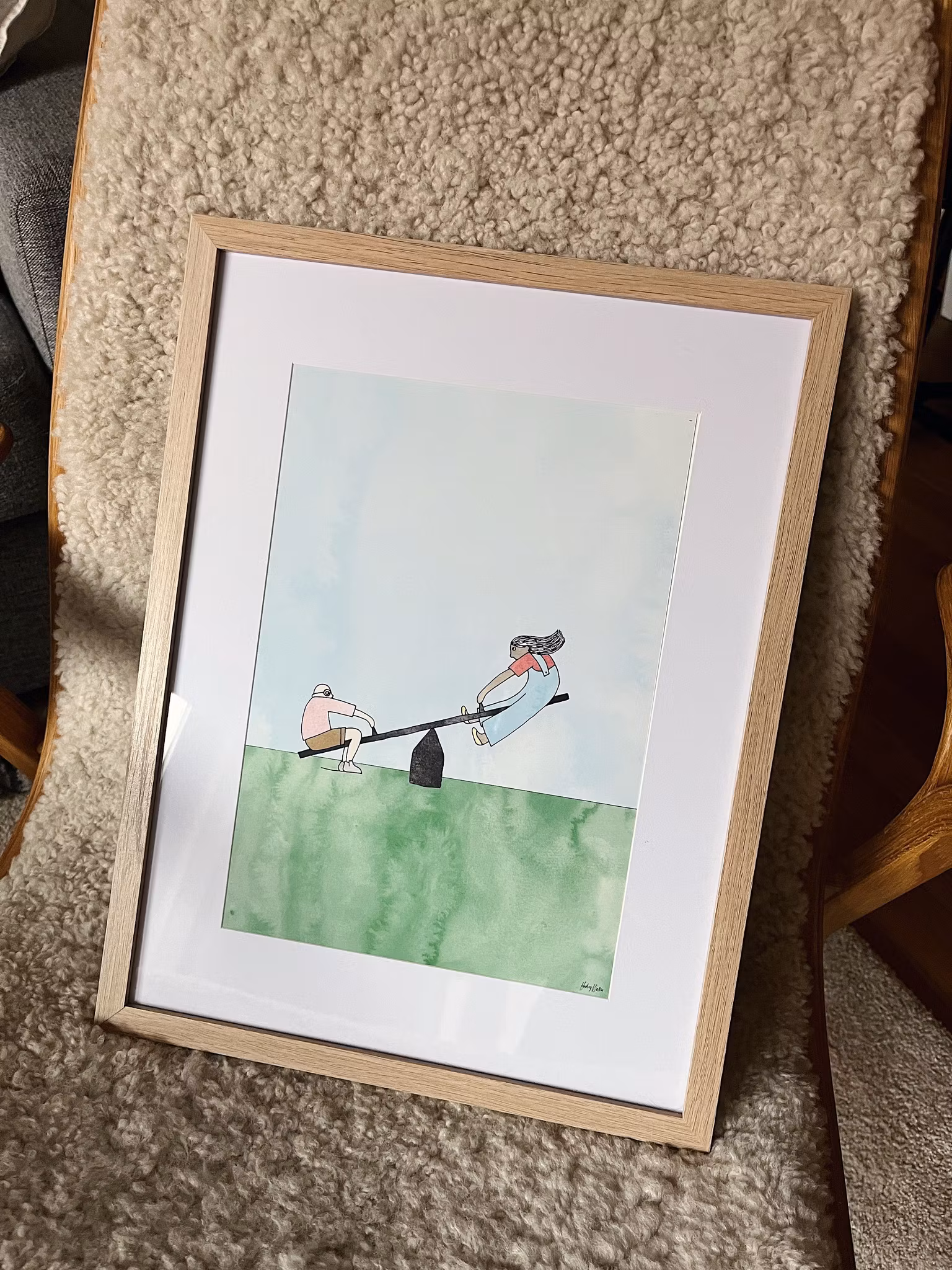 En lekfull illustration av två barn på en gungbräda, med stora färgfält av akvarell. En bild som ger en känsla av rörelse. Flickan svävar högt med vinden i håret, medan pojken håller balansen. Högkvalitativt print på 180 g FSC-certifierat, matt papper. Säljs i storlekarna 21x30 cm och 30x40 cm. Tillverkad i Sverige. Ram ingår ej.