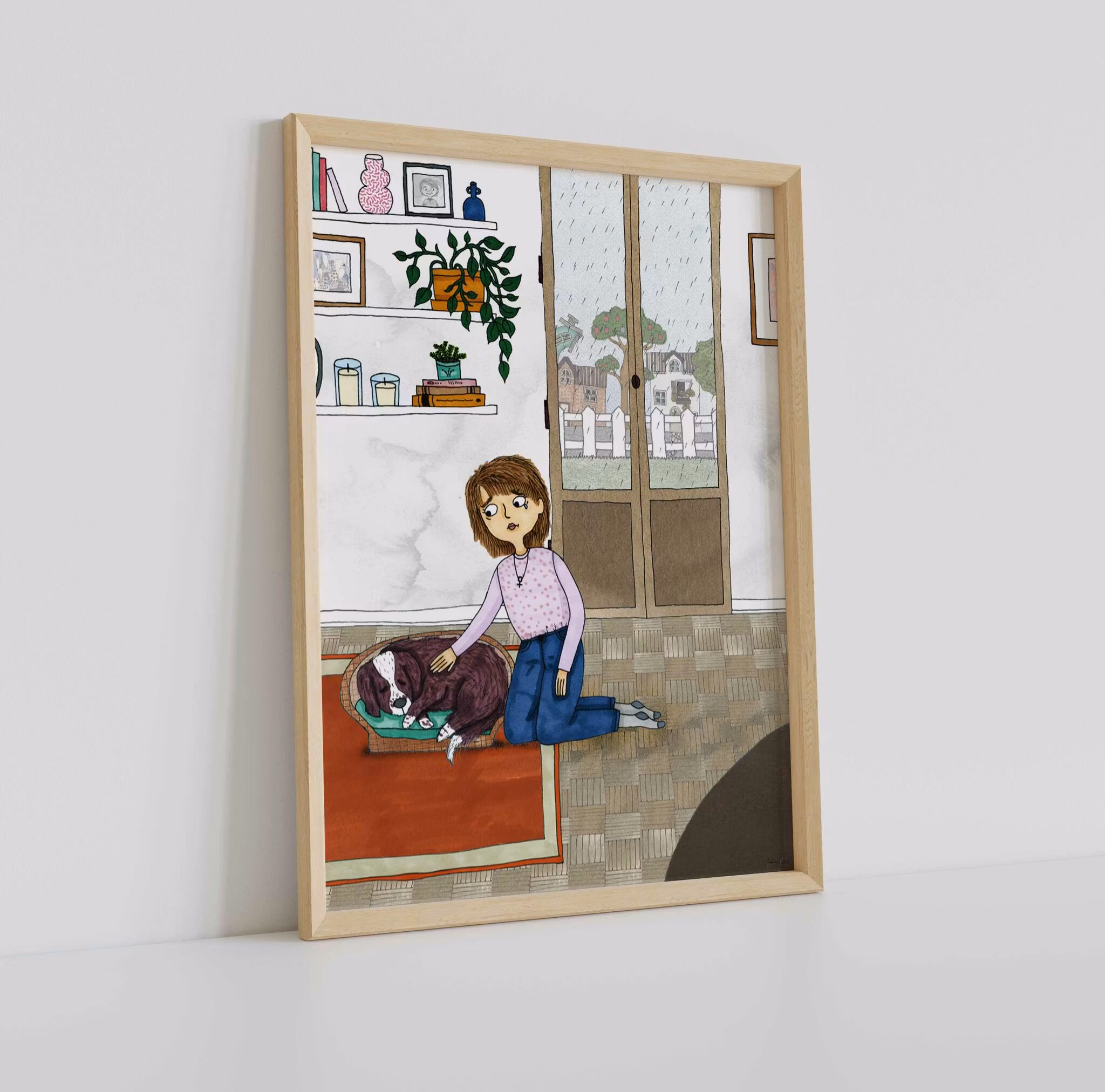 En finstämd och lite sorgsen poster med barnbokstema på en matte som är orolig över sin hund. Illustration ur barnboken "Hejdå Gino!". Högkvalitativt print på 180 g FSC-certifierat, matt papper. Säljs i storlekarna 21x30 cm och 30x40 cm. Tillverkad i Sverige. Ram ingår ej.