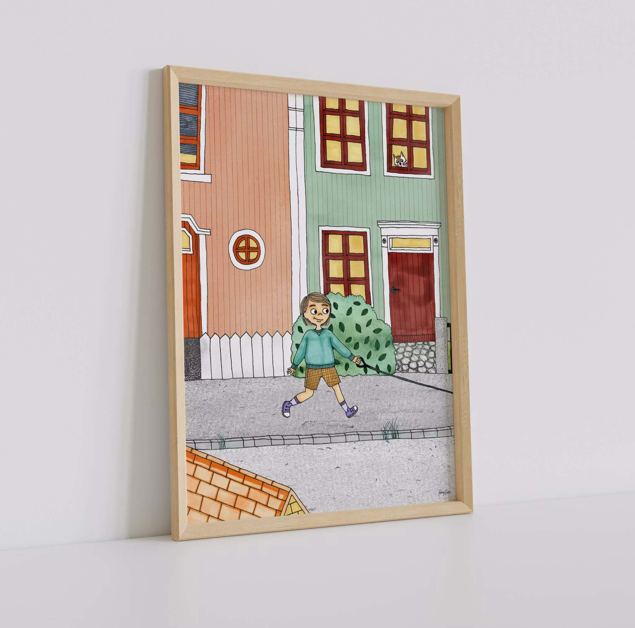 En lekfull och charmig poster med barnbokstema på Charlie som är ute på hundpromenad bland färgglada radhus. Illustration ur barnboken "Hejdå Gino!". Högkvalitativt print på 180 g FSC-certifierat, matt papper. Säljs i storlekarna 21x30 cm och 30x40 cm. Tillverkad i Sverige. Ram ingår ej.