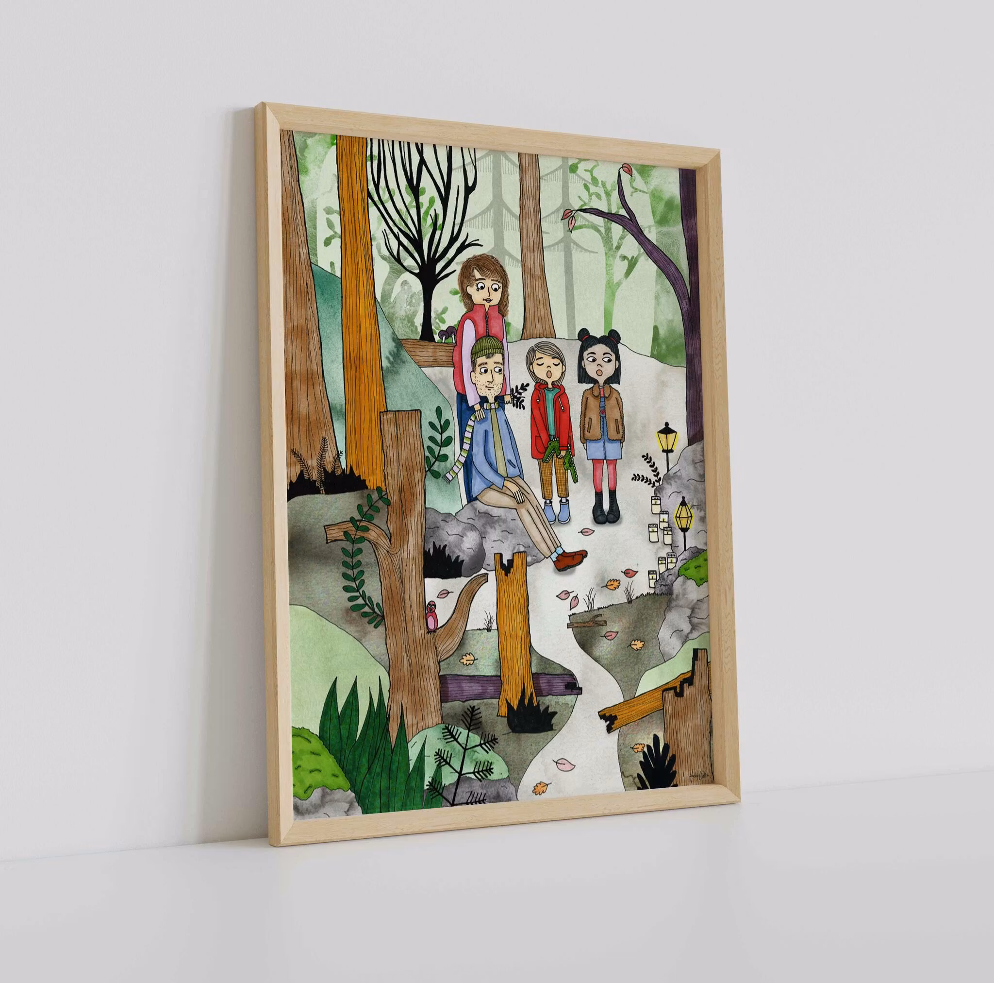 En detaljrik och charmig poster med barnbokstema på människor som har en minnesstund i skogen bland massa träd. Illustration ur barnboken "Hejdå Gino!". Högkvalitativt print på 180 g FSC-certifierat, matt papper. Säljs i storlekarna 21x30 cm och 30x40 cm. Tillverkad i Sverige. Ram ingår ej.