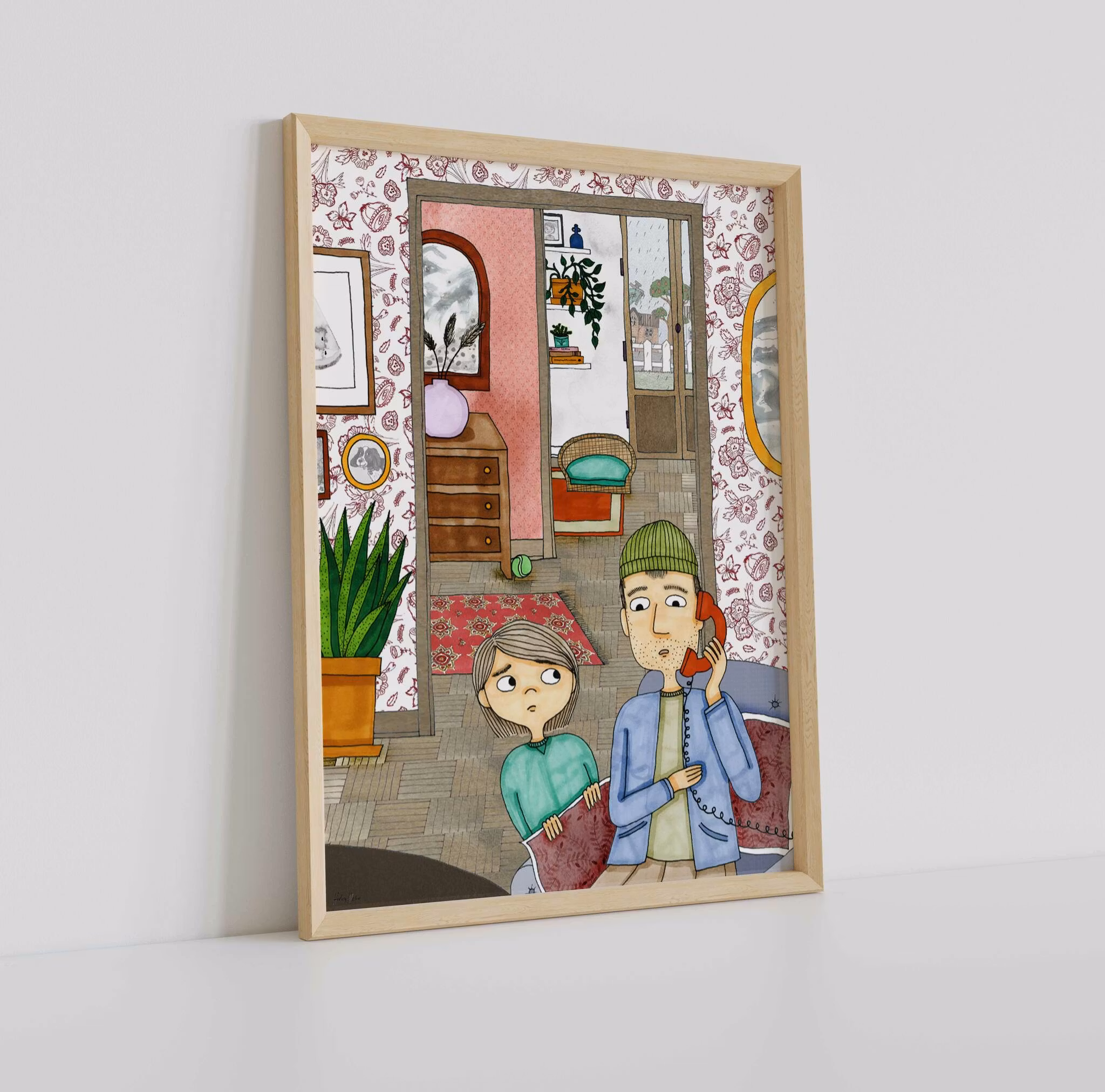 En detaljrik och lite sorgsen poster med barnbokstema på Charlie och hans pappa som pratar oroligt i telefon. Illustration ur barnboken "Hejdå Gino!". Högkvalitativt print på 180 g FSC-certifierat, matt papper. Säljs i storlekarna 21x30 cm och 30x40 cm. Tillverkad i Sverige. Ram ingår ej.