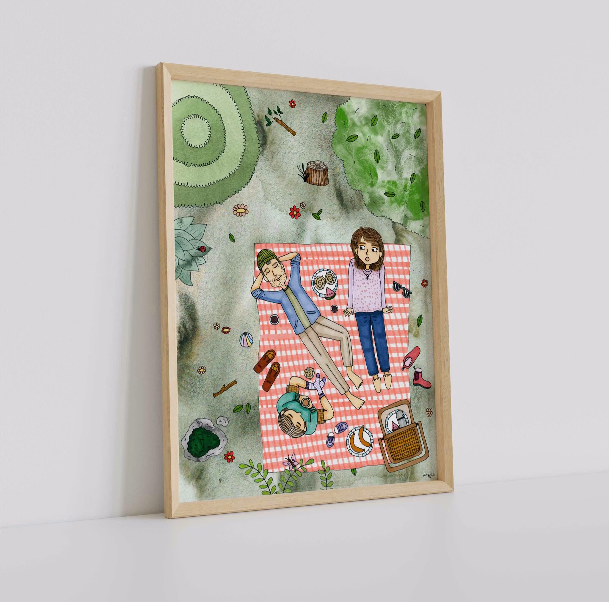 En lekfull och detaljrik poster med barnbokstema på en familj som har picknick i en grönskande skog. Illustration ur barnboken "Hejdå Gino!". Högkvalitativt print på 180 g FSC-certifierat, matt papper. Säljs i storlekarna 21x30 cm och 30x40 cm. Tillverkad i Sverige. Ram ingår ej.