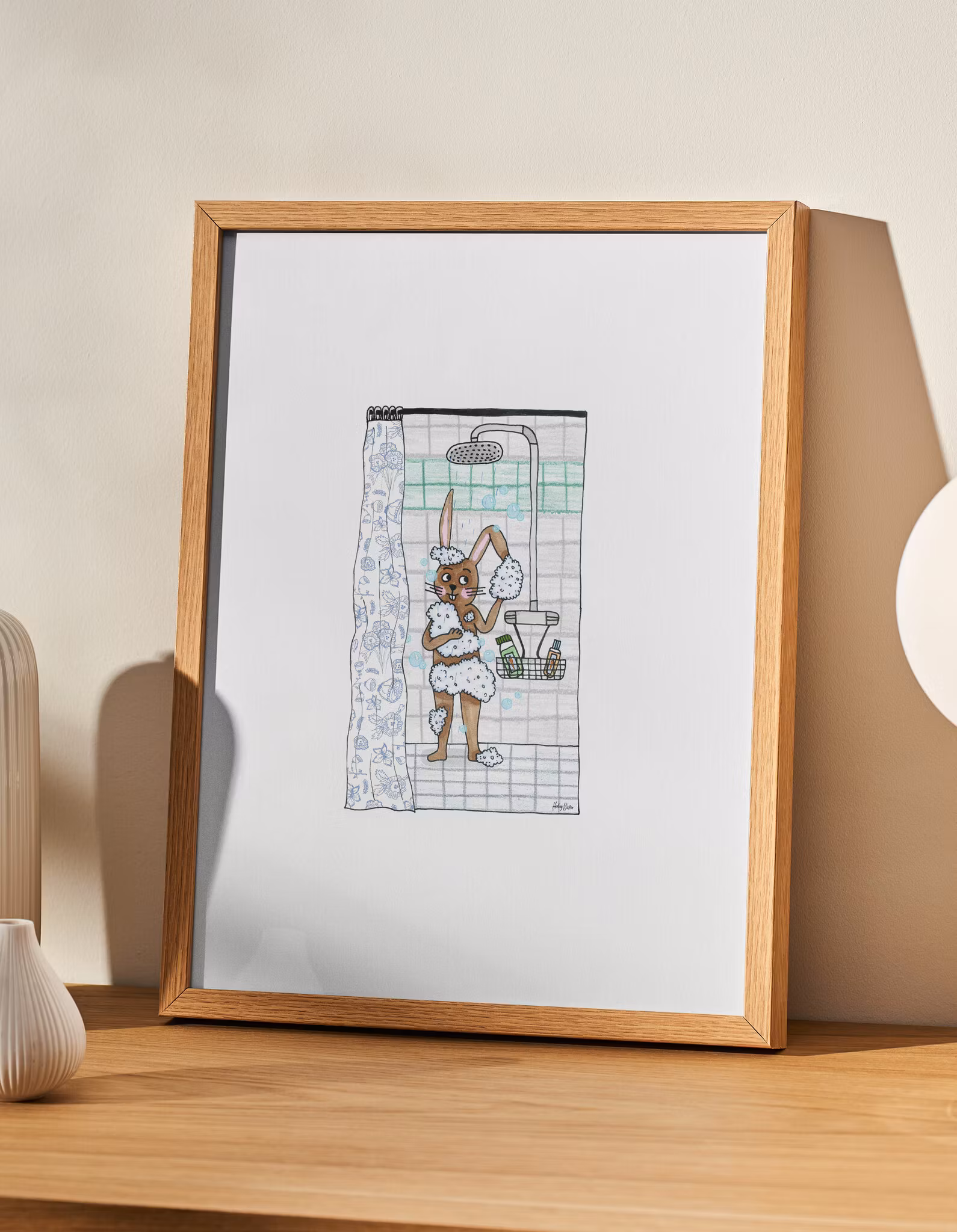 En lekfull och rolig poster med barnbokstema på kaninen Skuttis som duschar. Illustration ur barnboken "Skuttis campar". Passar perfekt till både barnrummet och badrummet! Högkvalitativt print på 180 g FSC-certifierat, matt papper. Säljs i storlekarna 21x30 cm, 30x40 cm, 30x30 cm och 40x40 cm. Tillverkad i Sverige. Ram ingår ej.