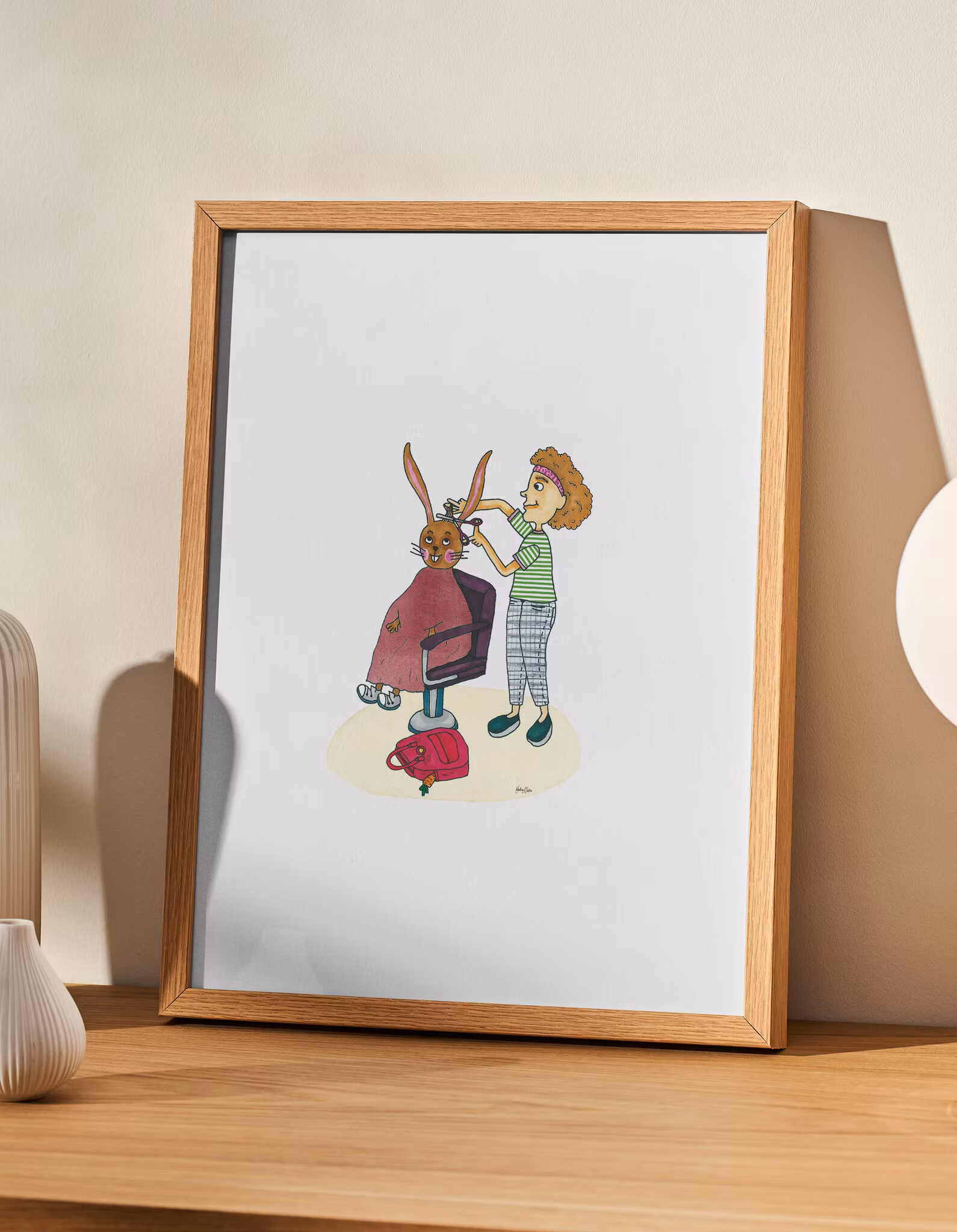 En lekfull och charmig poster med barnbokstema på kaninen Skuttis som klipper sig hos frisören. Illustration ur barnboken "Skuttis – Det stora morotskalaset". Högkvalitativt print på 180 g FSC-certifierat, matt papper. Säljs i storlekarna 21x30 cm och 30x30 cm. Tillverkad i Sverige. Ram ingår ej.