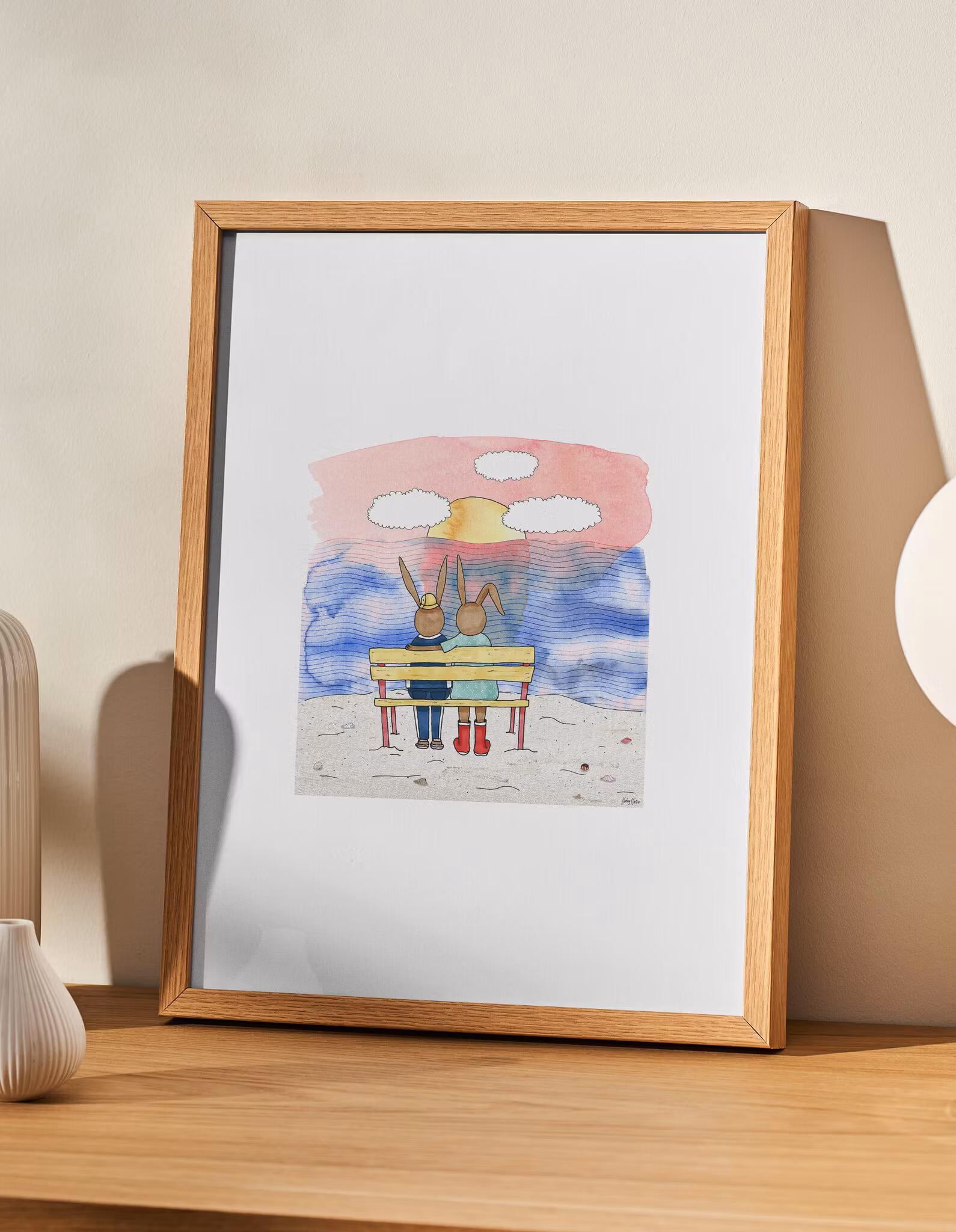 En lekfull och charmig poster med barnbokstema på kaninen Skuttis som sitter på en bänk med sin vän i solnedgången. Illustration ur barnboken "Skuttis campar". Högkvalitativt print på 180 g FSC-certifierat, matt papper. Säljs i storlekarna 21x30 cm, 30x40 cm, 30x30 cm och 40x40 cm. Tillverkad i Sverige. Ram ingår ej.