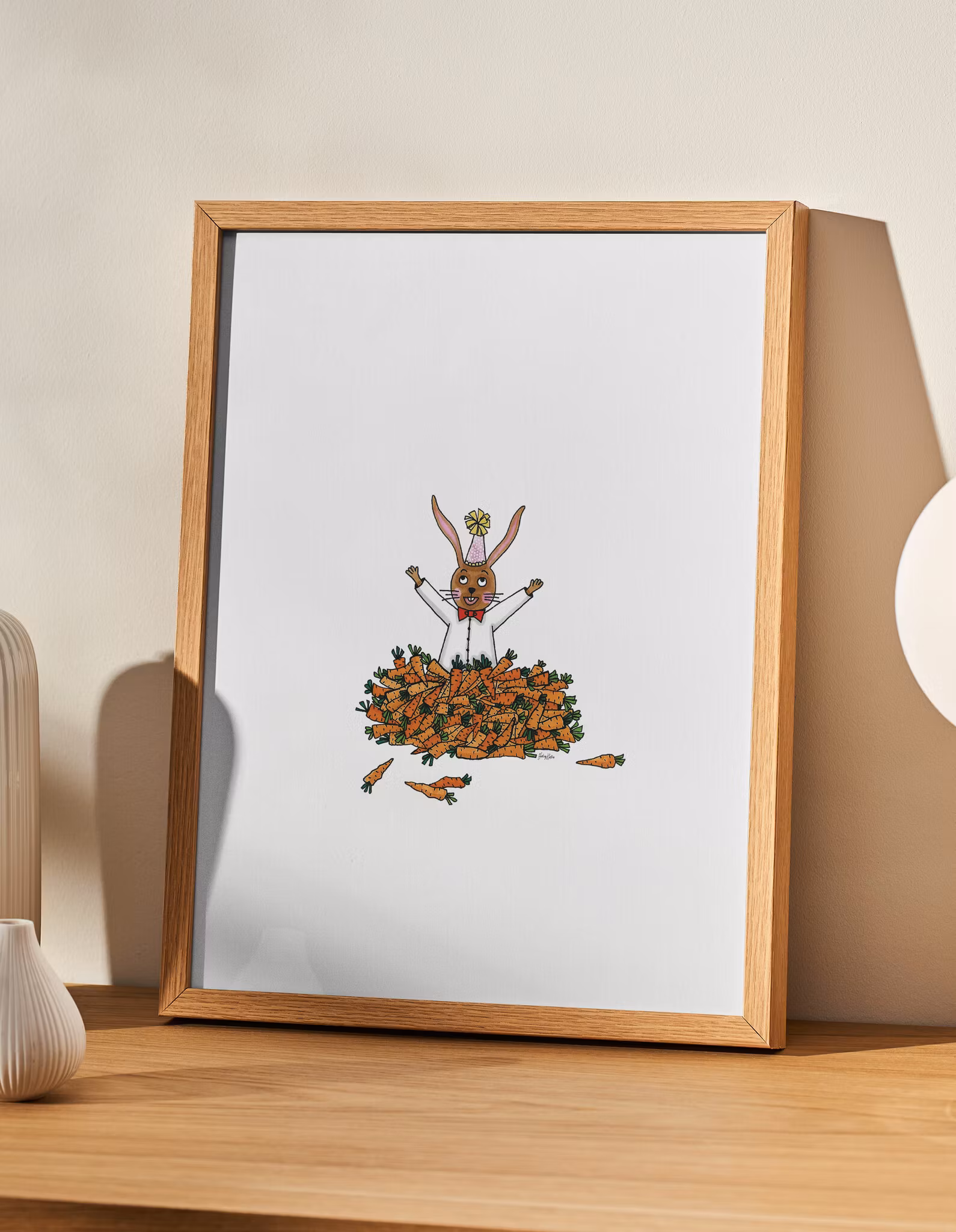 En lekfull och charmig poster med barnbokstema på Skuttis lillebror i en hög med morötter. Illustration ur barnboken "Skuttis – Det stora morotskalaset". Högkvalitativt print på 180 g FSC-certifierat, matt papper. Säljs i storlekarna 21x30 cm och 30x30 cm. Tillverkad i Sverige. Ram ingår ej.