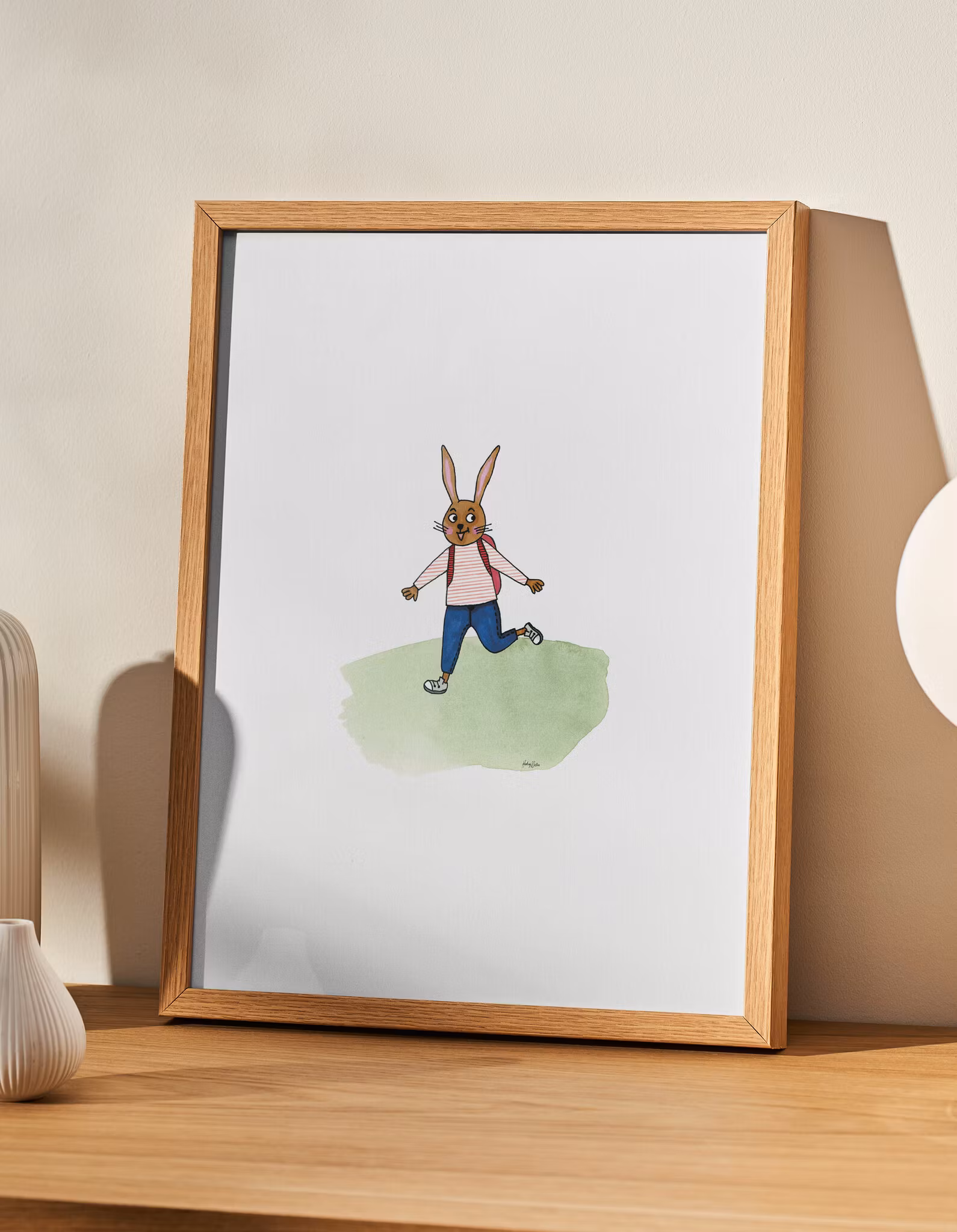 En lekfull och charmig poster med barnbokstema på kaninen Skuttis som springer. Illustration ur barnboken "Skuttis – Det stora morotskalaset". Högkvalitativt print på 180 g FSC-certifierat, matt papper. Säljs i storlekarna 21x30 cm och 30x30 cm. Tillverkad i Sverige. Ram ingår ej.