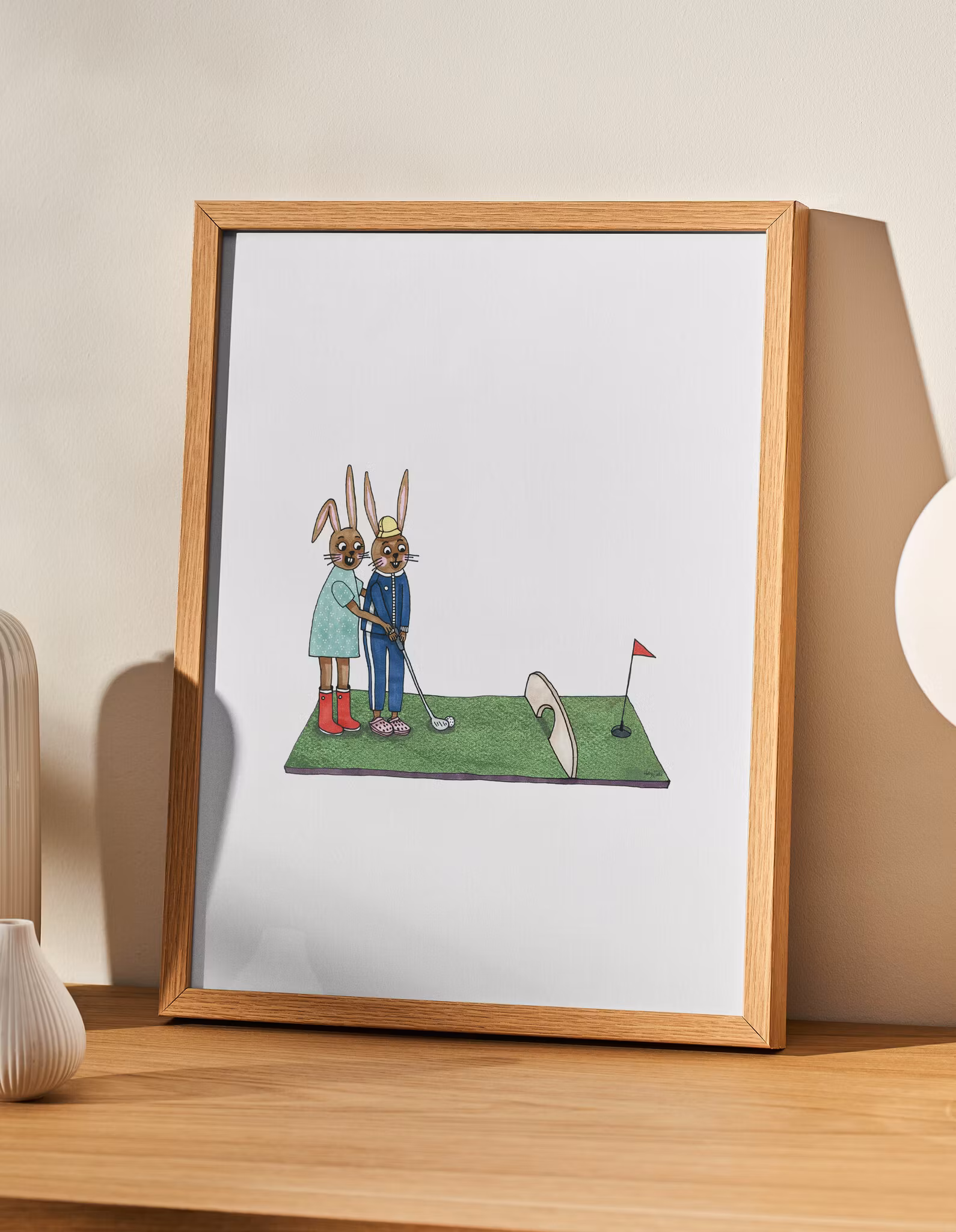En lekfull och charmig poster med barnbokstema på kaninen Skuttis som spelar golf med sin vän. Illustration ur barnboken "Skuttis campar". Högkvalitativt print på 180 g FSC-certifierat, matt papper. Säljs i storlekarna 21x30 cm, 30x40 cm, 30x30 cm och 40x40 cm. Tillverkad i Sverige. Ram ingår ej.