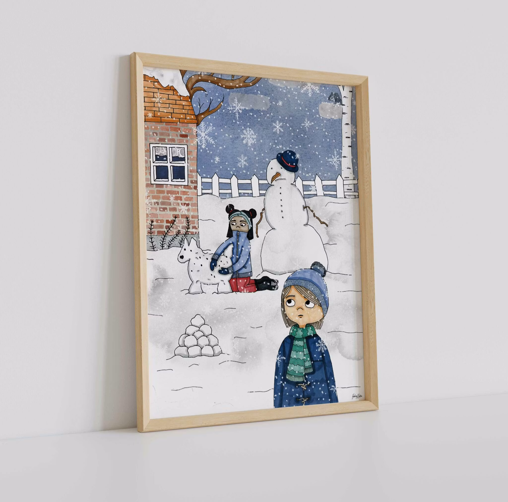 En detaljrik och lite sorgsen poster med barnbokstema på två barn som leker i snön samtidigt som de längtar efter sin hund. Illustration ur barnboken "Hejdå Gino!". Högkvalitativt print på 180 g FSC-certifierat, matt papper. Säljs i storlekarna 21x30 cm och 30x40 cm. Tillverkad i Sverige. Ram ingår ej.